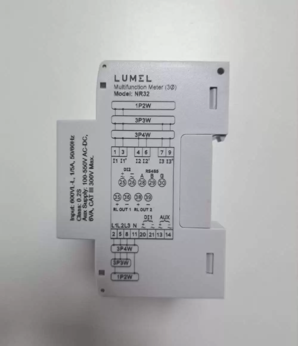 LUMEL, ENERGY METER, 3 PHASE, DIN RAIL, VOLTAGE I/P: 100-600V L-L, CURRENT I/P: 1A/5A, AUX. SUPPLY: 100-550V AC/DC, WITH RS485, 2 BINARY I/P, 2 RELAY O/P, OLD NMID30-1, NR32 330102CH200M0