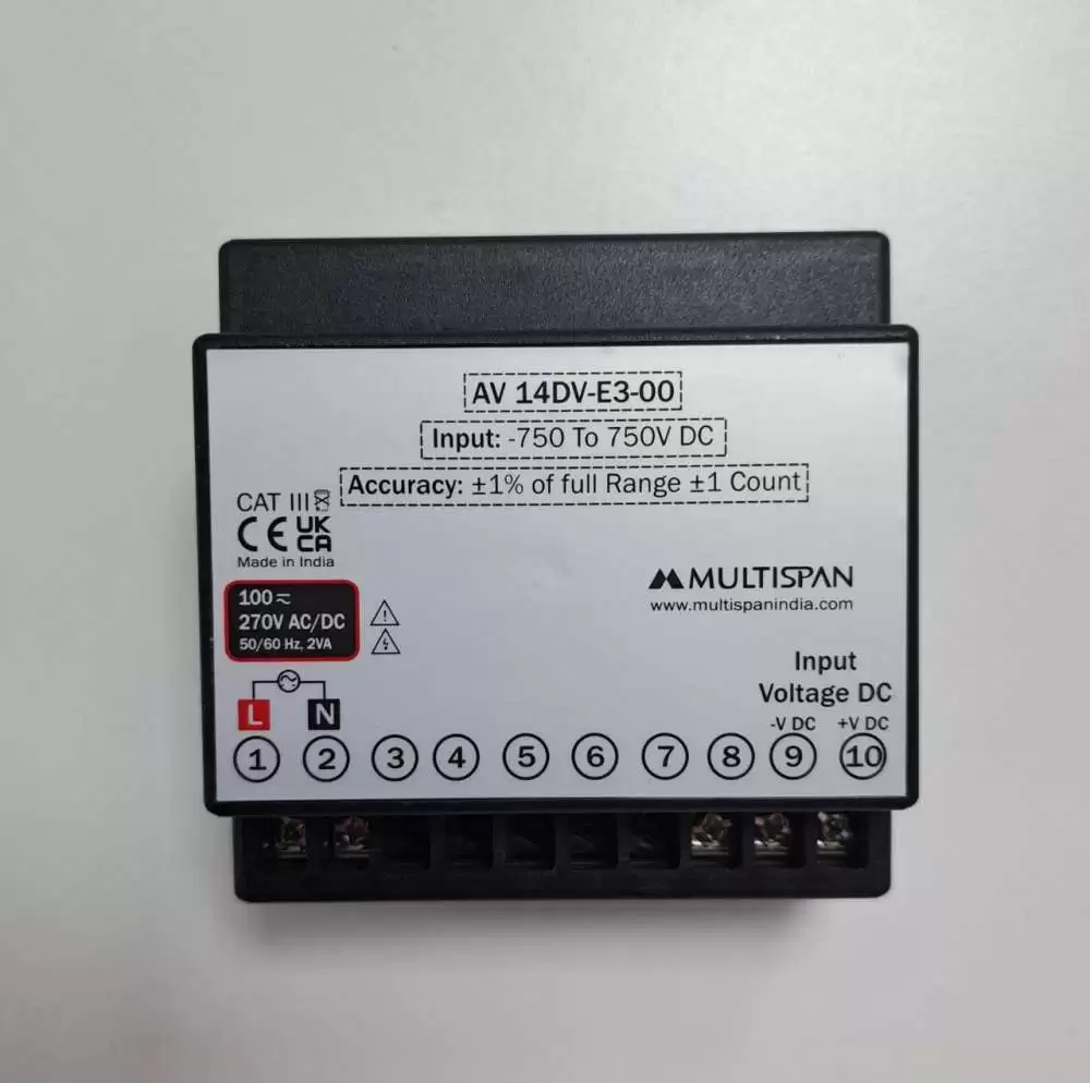 MULTISPAN, DIGITAL VOLTMETER, DC, 101x101mm, INPUT: -750 TO 750V DC, UNIT: V, ACCURACY: +-1 OF FULL RANGE +-1 COUNT, AUXILIARY SUPPLY: 100-270V AC/DC, AV 14DV-E3-00