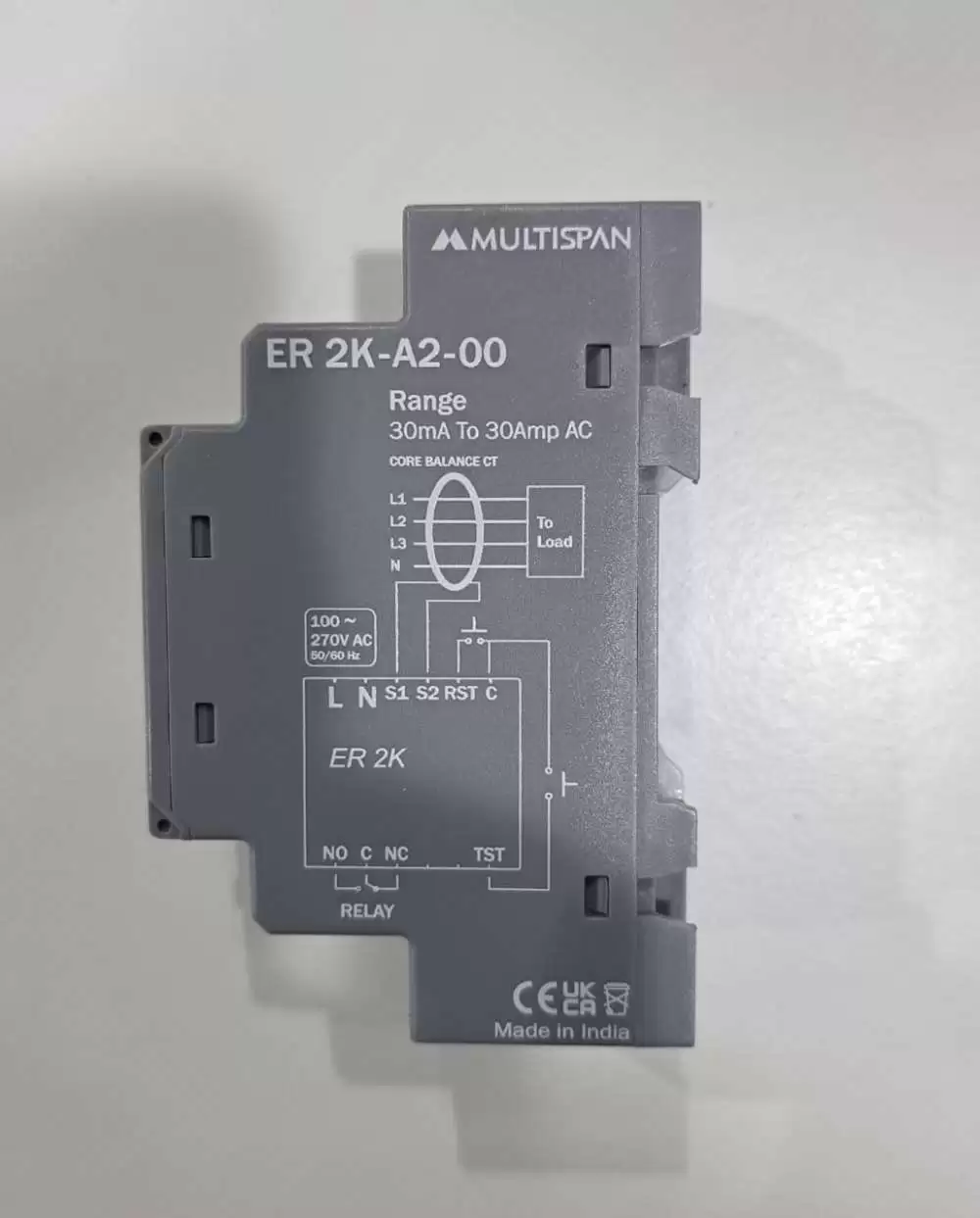 MULTISPAN, EARTH LEAKAGE RELAY, ANALOG, CURRENT SETTING: 30mA-30A, TIME DELAY: 0-10 SECOND, AUXILIARY SUPPLY: 100-270V AC, 50/60 Hz, ER 2K-A2-00