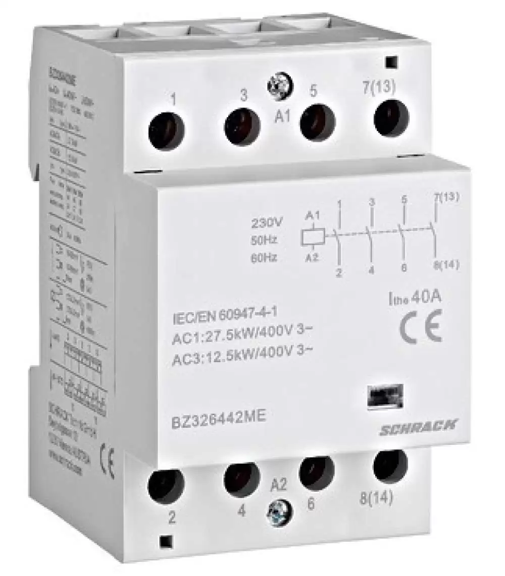 SCHRACK, MODULAR CONTACTOR, 40A, 4 NO, COIL VOLTAGE: 230VAC, DIN RAIL MOUNT, 3MW, AMPARO, BZ326442ME