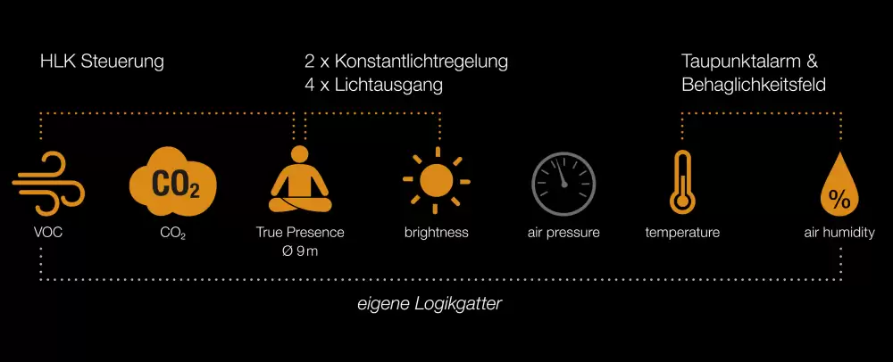 | KNX FUNCTION | Photo-cell controller, Basic light level function, Light level, HVAC output, Constant-lighting control, Light output 4x, Air pressure, Humidity output, Presence output, Day / night function, |