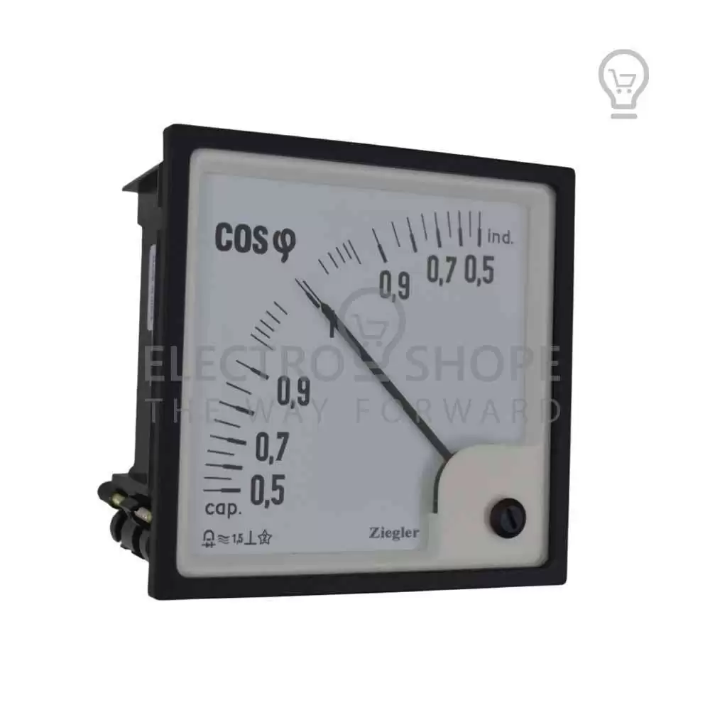 ZIEGLER, POWER FACTOR METER, 3 PHASE, 96x96, I/P: 380-415V AC, 5 A, 50/60 Hz, 90 DEG, CL 1.5, IP 52, CQ 96